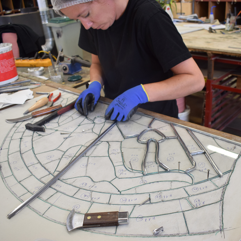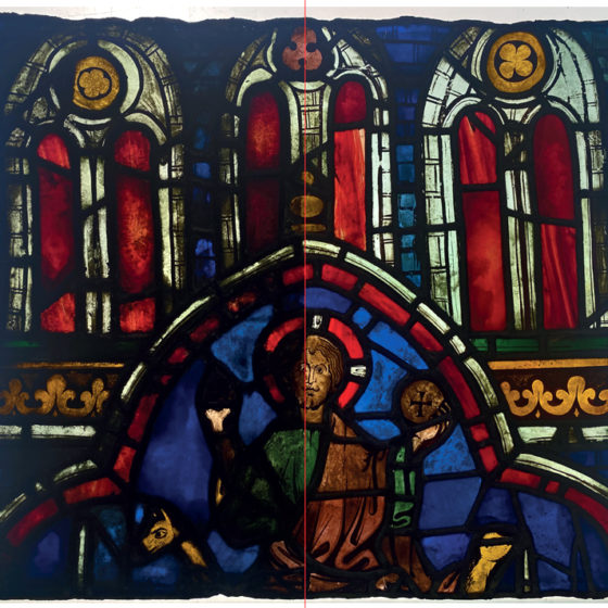 Une verrière de doublage sera mise en place en face externe de la baie. A l’instar de ce qui a déjà été fait sur les baies basses, les vitraux anciens seront déplacés vers l’intérieur de la baie. La verrière de doublage venant se loger dans la feuillure existante, reprend les contours simplifiés des vitraux figuratifs du XIIIème siècle.
