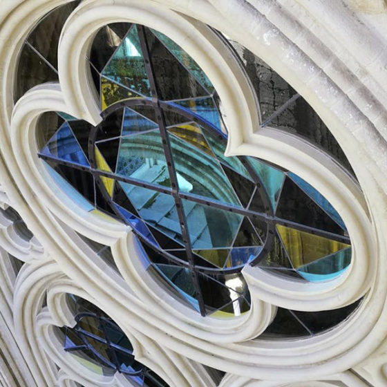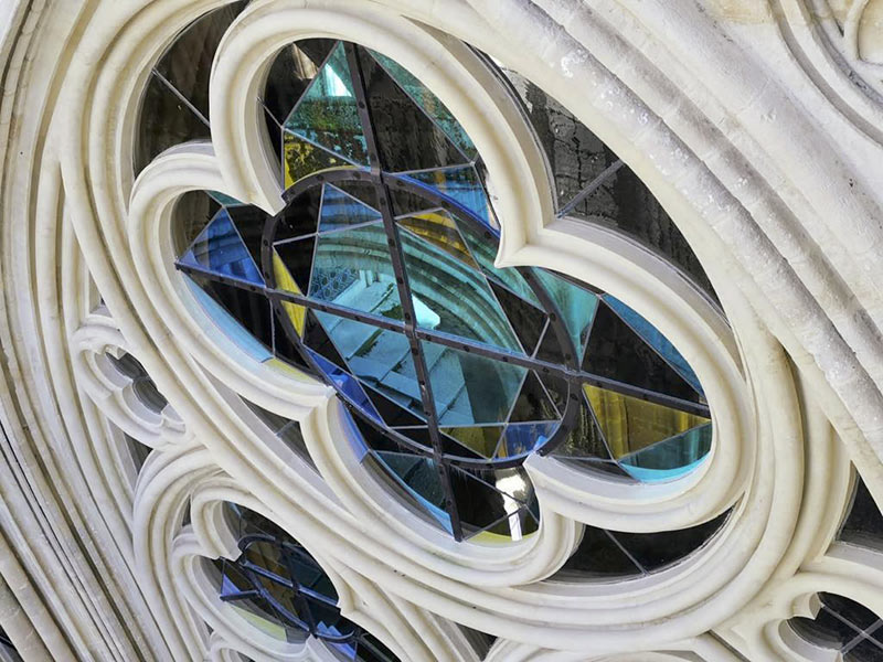 La couleur est présente par touches et se localise principalement au niveau des tympans et des polylobes circulaires situés dans les parties hautes des baies. Chaque pièce est composée de 170 morceaux de verre dichroïque colorés et de verre antique soufflé bouche que nous avons dû renforcer par un verre flotté avant assemblage.